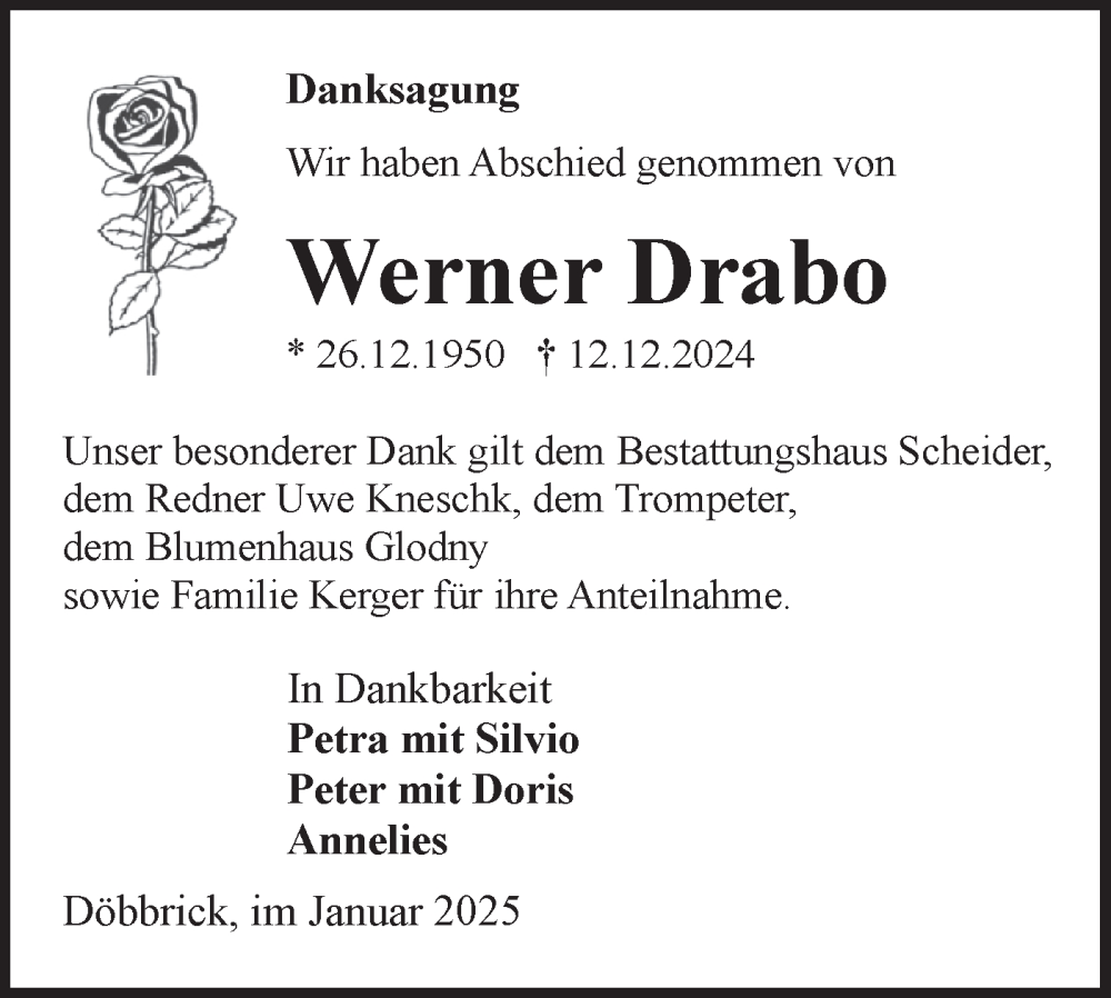Hier finden Sie alle Traueranzeigen aus der Zeitung, die bisher für Werner Drabo erschienen sind. Weitere Traueranzeigen, die in der Zeitung erscheinen, werden hier ebenfalls aufgelistet