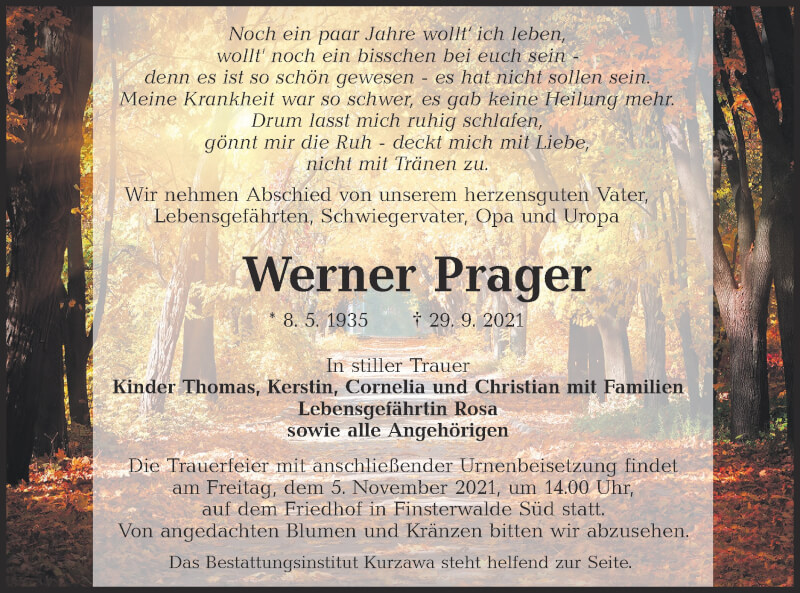 Hier finden Sie alle Traueranzeigen aus der Zeitung, die bisher für Werner Prager erschienen sind. Weitere Traueranzeigen, die in der Zeitung erscheinen, werden hier ebenfalls aufgelistet