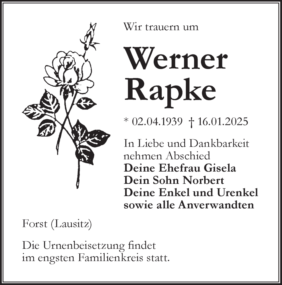 Hier finden Sie alle Traueranzeigen aus der Zeitung, die bisher für Werner Rapke erschienen sind. Weitere Traueranzeigen, die in der Zeitung erscheinen, werden hier ebenfalls aufgelistet