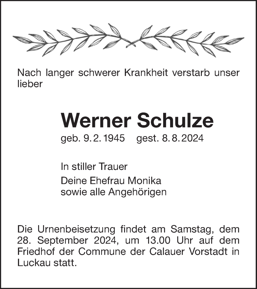 Hier finden Sie alle Traueranzeigen aus der Zeitung, die bisher für Werner Schulze erschienen sind. Weitere Traueranzeigen, die in der Zeitung erscheinen, werden hier ebenfalls aufgelistet