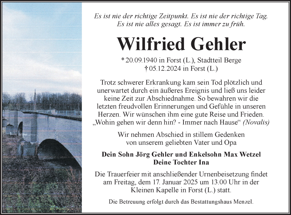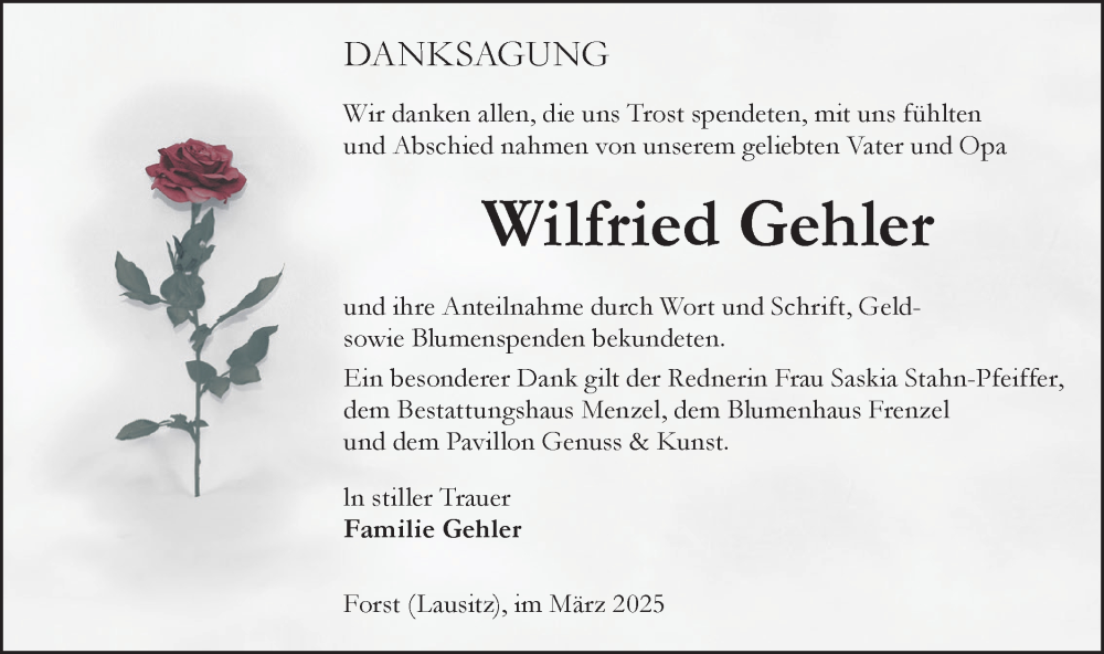 Hier finden Sie alle Traueranzeigen aus der Zeitung, die bisher für Wilfried Gehler erschienen sind. Weitere Traueranzeigen, die in der Zeitung erscheinen, werden hier ebenfalls aufgelistet
