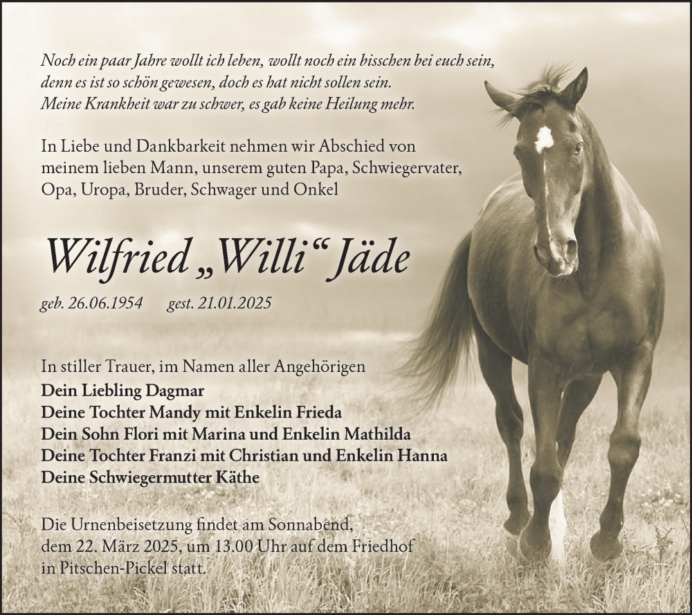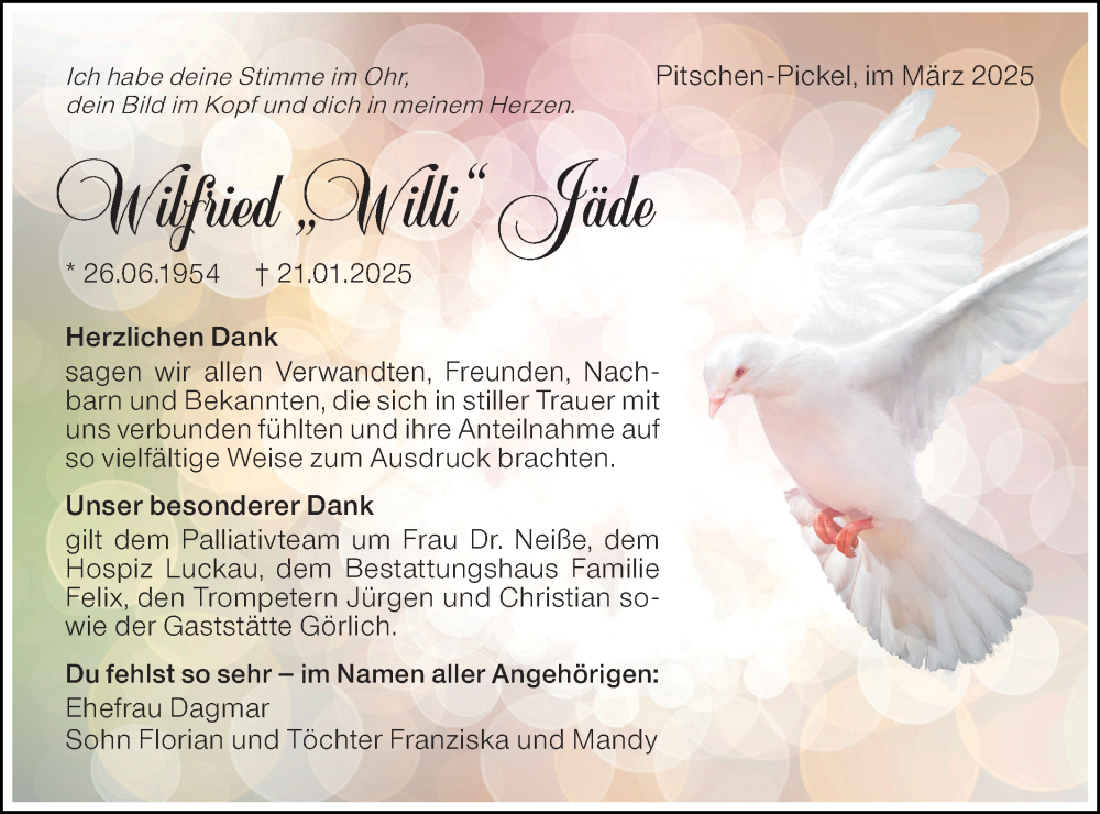 Hier finden Sie alle Traueranzeigen aus der Zeitung, die bisher für Wilfried Jäde erschienen sind. Weitere Traueranzeigen, die in der Zeitung erscheinen, werden hier ebenfalls aufgelistet