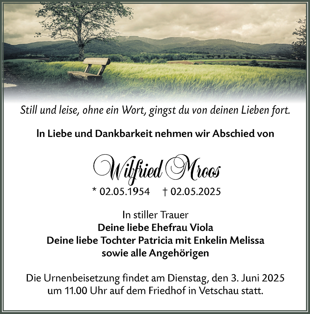 Hier finden Sie alle Traueranzeigen aus der Zeitung, die bisher für Wilfried Mroos erschienen sind. Weitere Traueranzeigen, die in der Zeitung erscheinen, werden hier ebenfalls aufgelistet