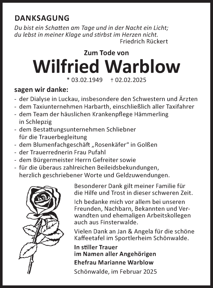 Hier finden Sie alle Traueranzeigen aus der Zeitung, die bisher für Wilfried Warblow erschienen sind. Weitere Traueranzeigen, die in der Zeitung erscheinen, werden hier ebenfalls aufgelistet