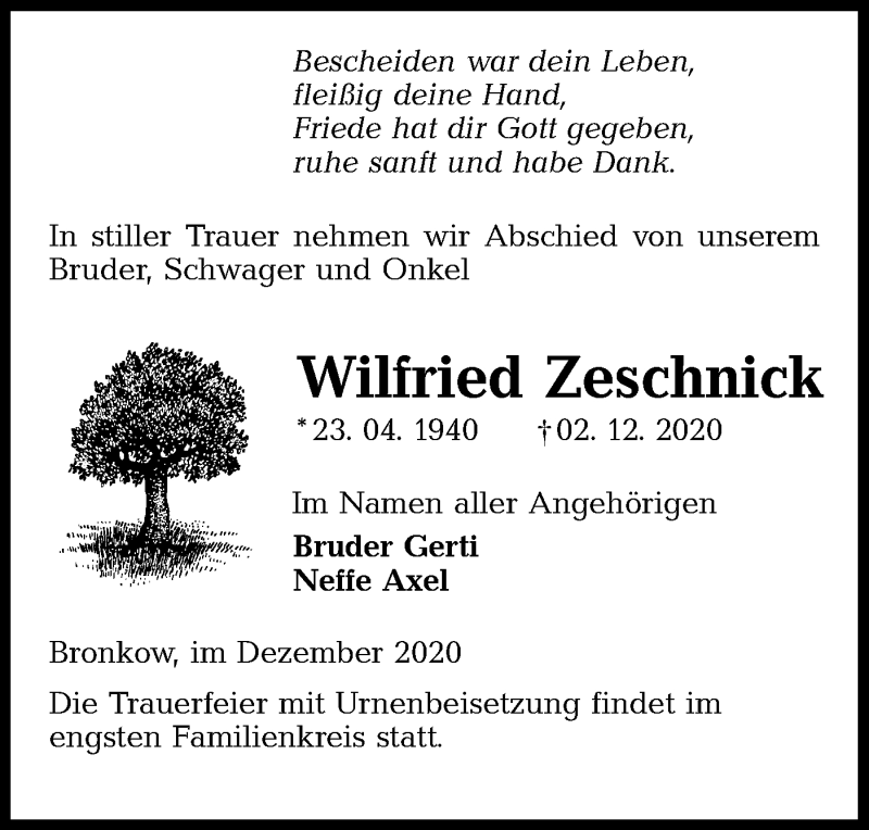 Hier finden Sie alle Traueranzeigen aus der Zeitung, die bisher für Wilfried Zeschnick erschienen sind. Weitere Traueranzeigen, die in der Zeitung erscheinen, werden hier ebenfalls aufgelistet