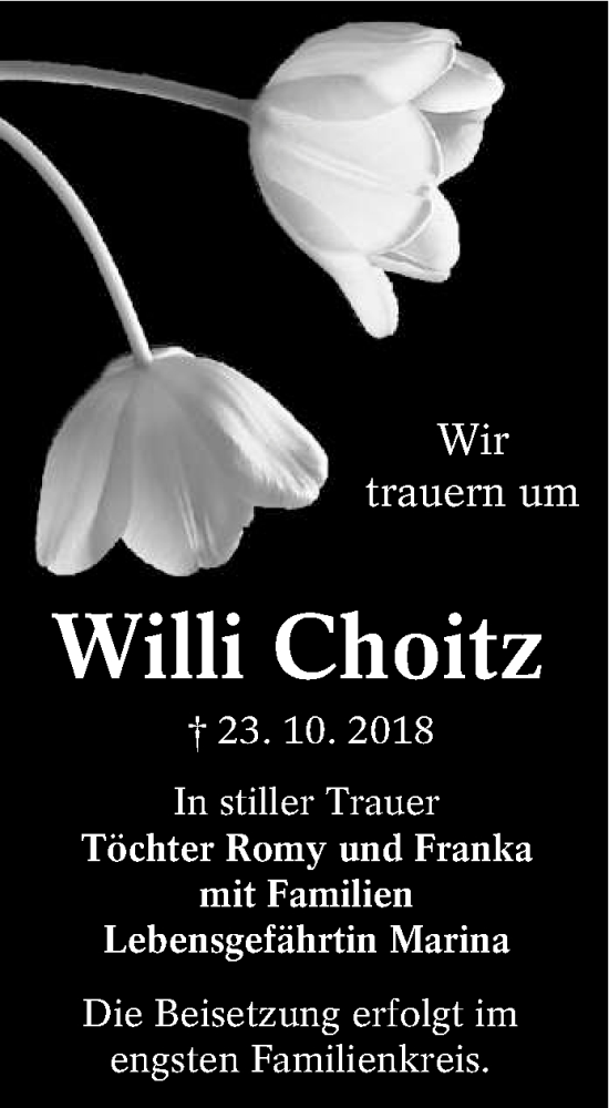 Hier finden Sie alle Traueranzeigen aus der Zeitung, die bisher für Willi Choitz erschienen sind. Weitere Traueranzeigen, die in der Zeitung erscheinen, werden hier ebenfalls aufgelistet