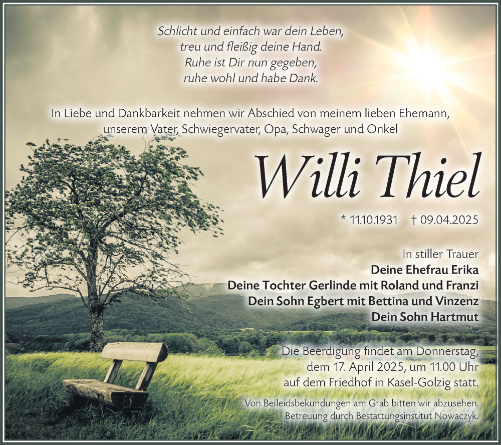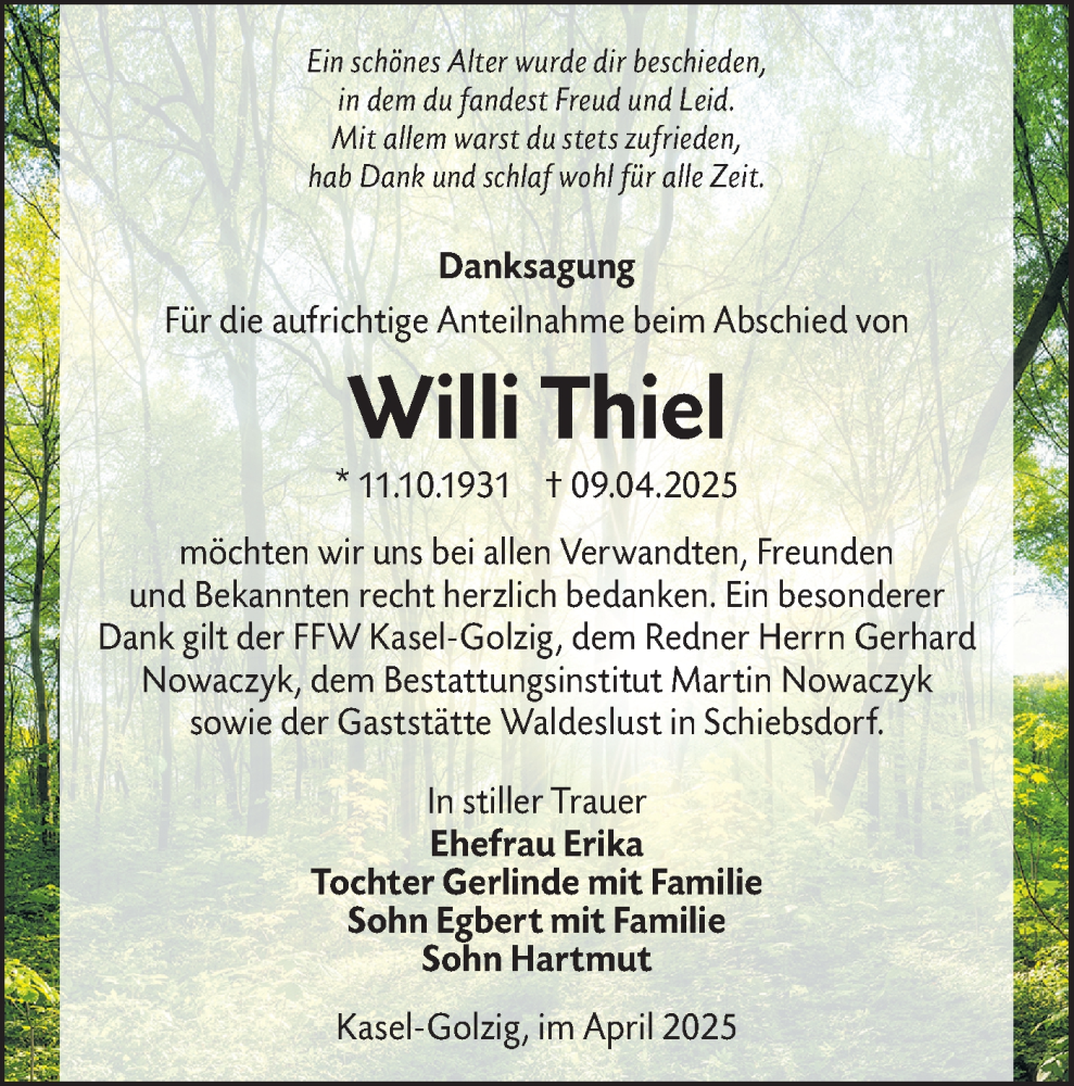 Hier finden Sie alle Traueranzeigen aus der Zeitung, die bisher für Willi Thiel erschienen sind. Weitere Traueranzeigen, die in der Zeitung erscheinen, werden hier ebenfalls aufgelistet