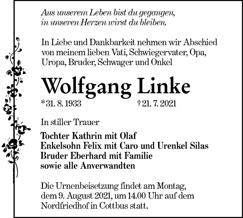 Hier finden Sie alle Traueranzeigen aus der Zeitung, die bisher für Wolfgang Linke erschienen sind. Weitere Traueranzeigen, die in der Zeitung erscheinen, werden hier ebenfalls aufgelistet