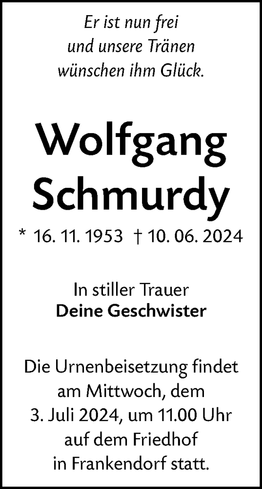 Hier finden Sie alle Traueranzeigen aus der Zeitung, die bisher für Wolfgang Schmurdy erschienen sind. Weitere Traueranzeigen, die in der Zeitung erscheinen, werden hier ebenfalls aufgelistet