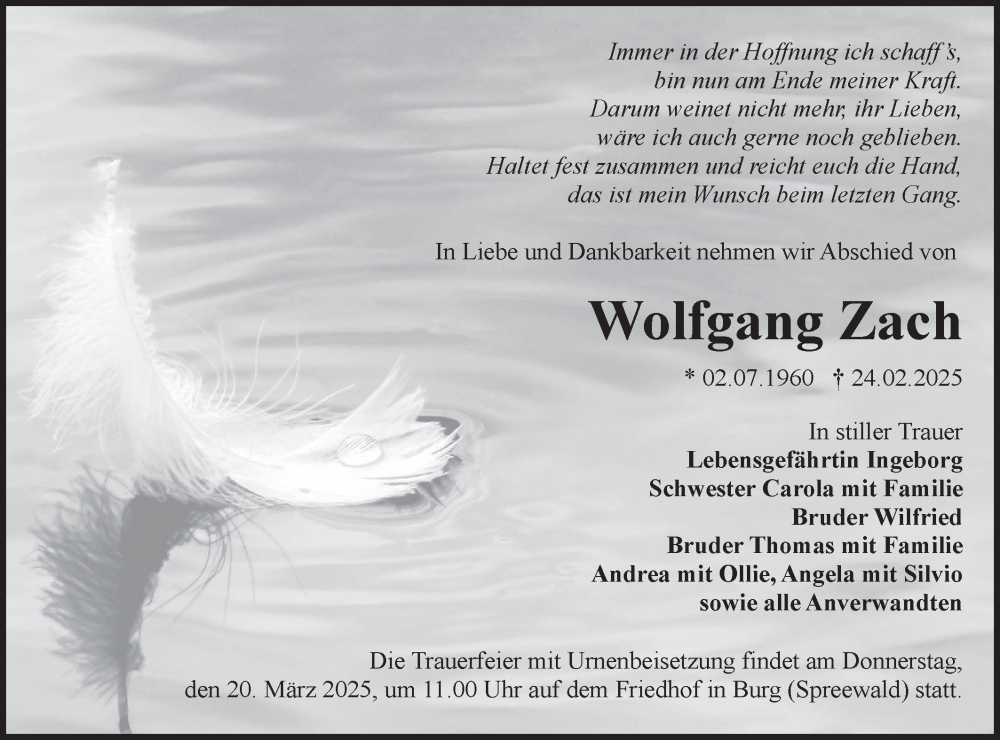 Hier finden Sie alle Traueranzeigen aus der Zeitung, die bisher für Wolfgang Zach erschienen sind. Weitere Traueranzeigen, die in der Zeitung erscheinen, werden hier ebenfalls aufgelistet