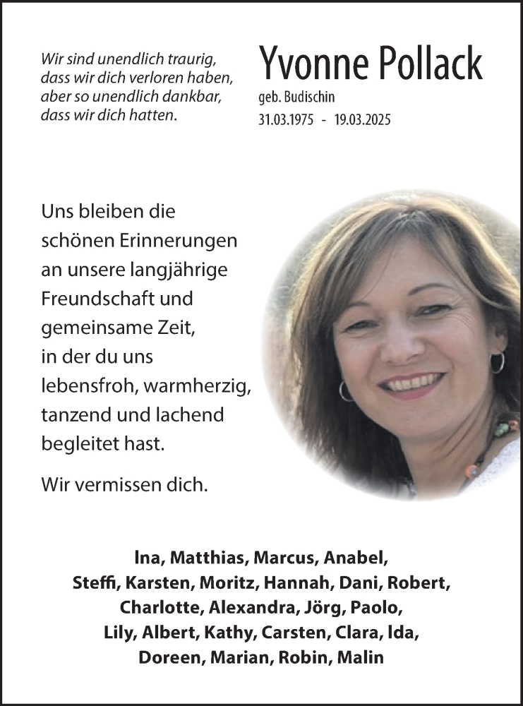 Hier finden Sie alle Traueranzeigen aus der Zeitung, die bisher für Yvonne Pollack erschienen sind. Weitere Traueranzeigen, die in der Zeitung erscheinen, werden hier ebenfalls aufgelistet